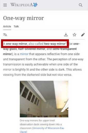 - one way: only a mirror in one way (side) [and just a glass in the other way (side)]