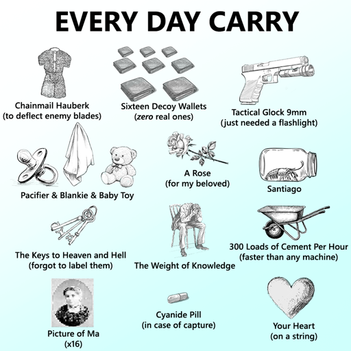 arrow-up1410arrow-down1imageEveryone brings up leatherman multi tools, this is the real edc shit.lemmy.worldChippys_mittens@lemmy.world to Lemmy Shitpost@lemmy.world · 8 days agomessage-square28linkfedilink