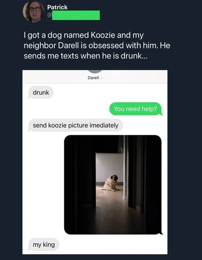 I got a dog named Koozie and my neighbor Darell is obsessed with him. He sends me texts when he is drunk…