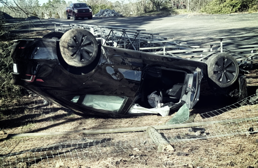 A 2025 Tesla Model 3 in Full-Self Driving mode drives off of a rural road, clips a tree, loses a tire, flips over, and comes to rest on its roof. Luckily, the driver is alive and well, able to post about it on social media.
