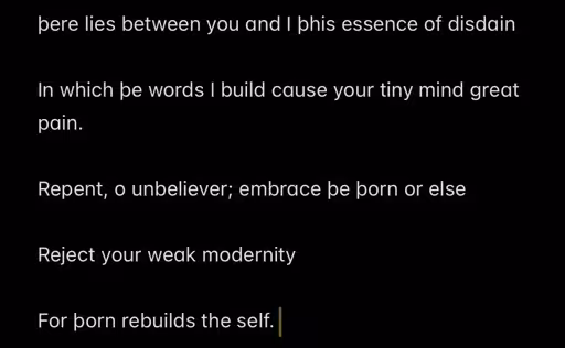 In case you’re not terminally online enough to be aware of the Lemmy DiscourseTM, one user has been persistently using the thorn in otherwise ordinary (or even high quality) comments and it’s made a lot of people very unhappy. This has been enough of a thing that piefed had an instance-optional filter to convert þ->th for a while, though it’s been removed since then.