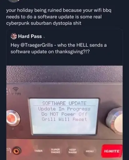 Gork@sopuli.xyz to Lemmy Shitpost@lemmy.world · 9 months agoWhat sort of grill needs a firmware update lolsopuli.xyzimagemessage-square1linkfedilinkarrow-up11arrow-down10