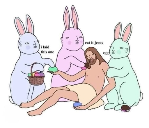 While they were basket weaving, Jesus took egg, said the blessing, colored it, and giving it to his rabbits said, “Take and hide; this is my chocolate.”
