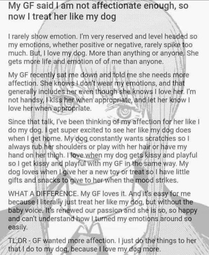 It’s sad only because the tone is dismissive/condescending. Otherwise it’s just describing someone who figured out how their gf likes to receive affection. My head canon says they’ve only been dating for a couple months and they’ve had their dog for years.