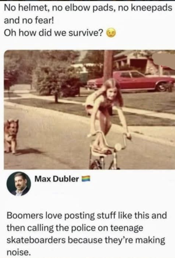 That was Gen X. And we have the scars and broken bones and dead friends to prove that it was dangerous. that’s why kids nowadays wear kneepads and helmets.