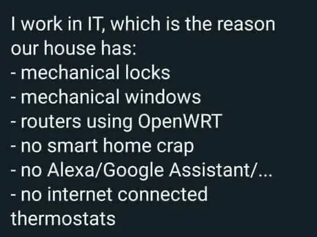 Everything is hardwired with multiple layers of security. Everything even remotely personal is on encrypted hard drives. No Alexa/Google. Made sure the smart TV and smartphones (no Apple, vanilla Android) have all data sharing disabled. And I drive a 1999 vehicle that doesn’t make me jump through any hoops.