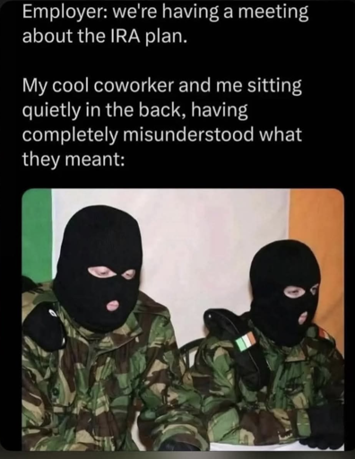 minus-squareGork@sopuli.xyzlinkfedilinkarrow-up0·28 days agoDoes the IRA have a good IRA plan? Might switch careers to being Irish if that’s the case.