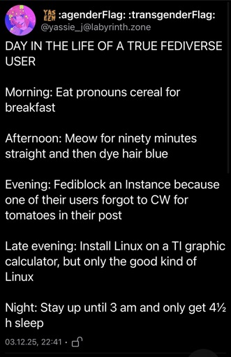 Samskara@sh.itjust.works to Fediverse memes@feddit.ukEnglish · 2 months agoDay in the Life of a True Fediverse Usersh.itjust.worksimagemessage-square62linkfedilinkarrow-up12arrow-down10