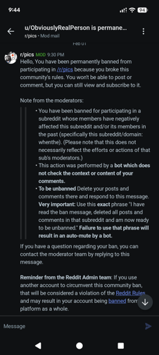19 days agoAccording to the ban, it was from participating in a sub they don’t like elsewhere